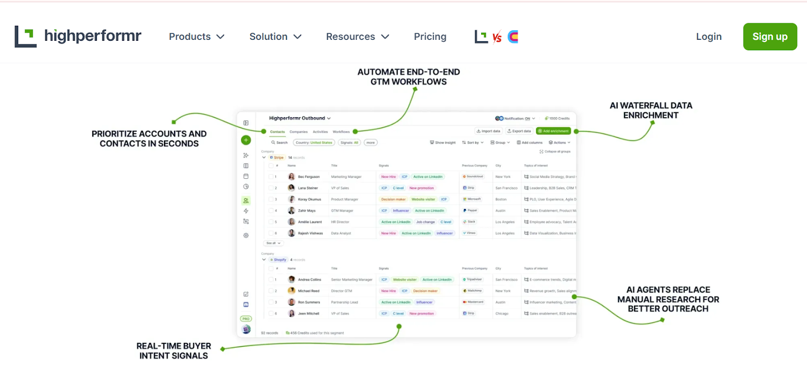 Highperformr.ai combines multi-source enrichment with GTM workflow automation and social CRM.