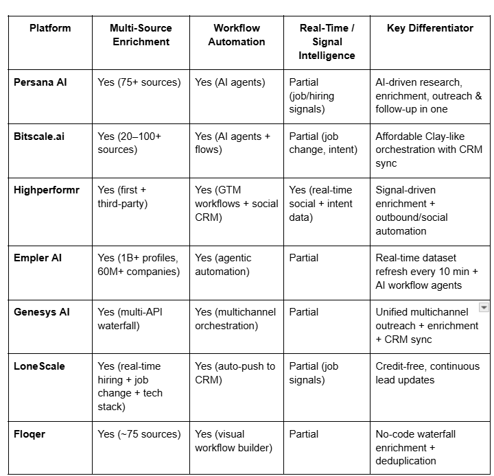 👉 True competitors → Offer both multi-source enrichment + workflow automation